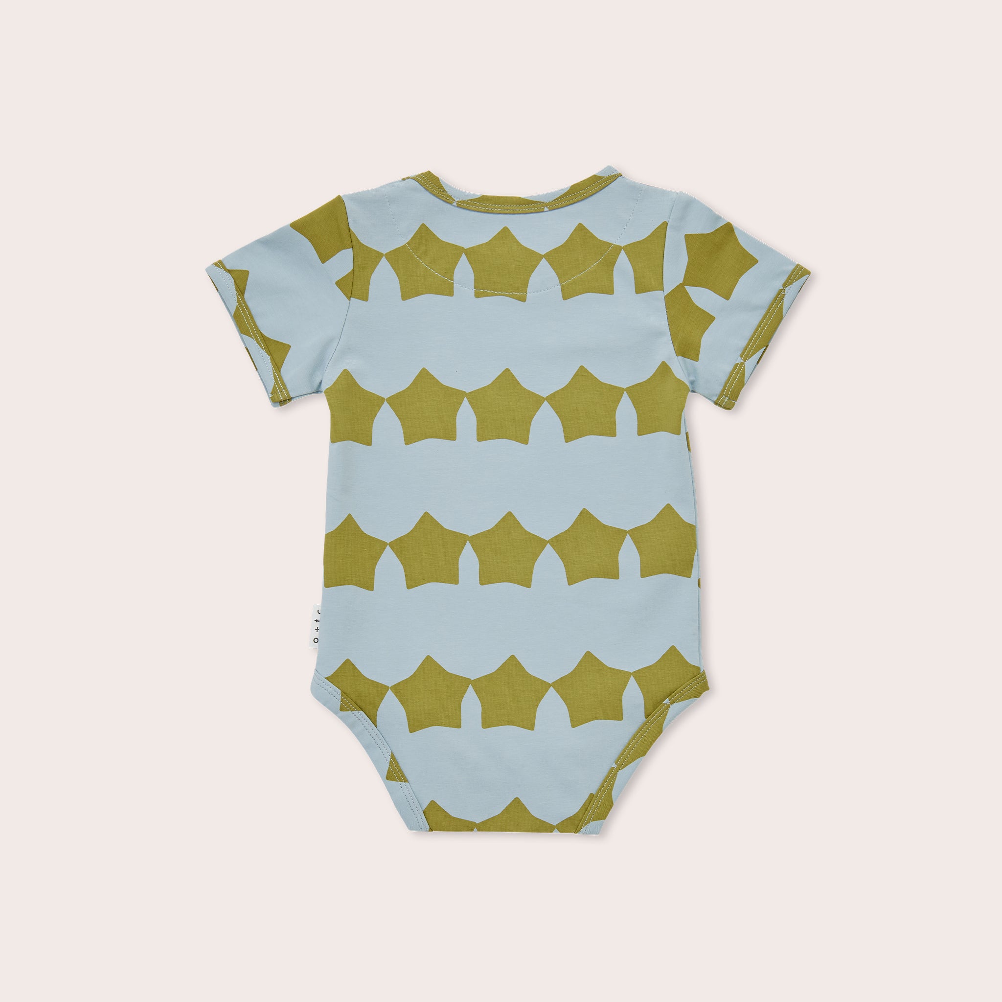 A grey blue base jersey long sleeve bodysuit with our large evergreen stars printed all over.