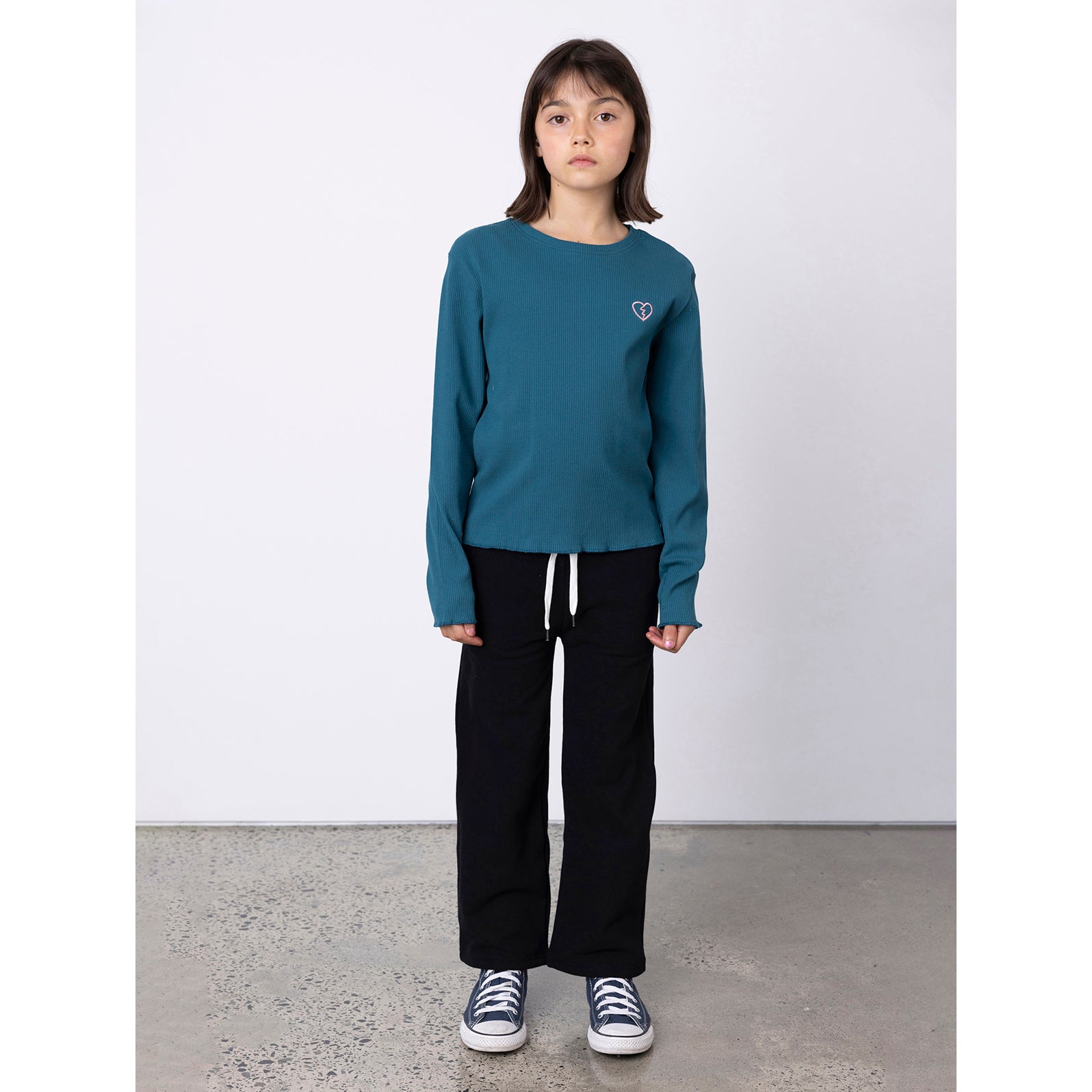 Boxy style long sleeved tee with lettuce trim on the sleeves and hem. 95% Cotton // 5% Elastane.