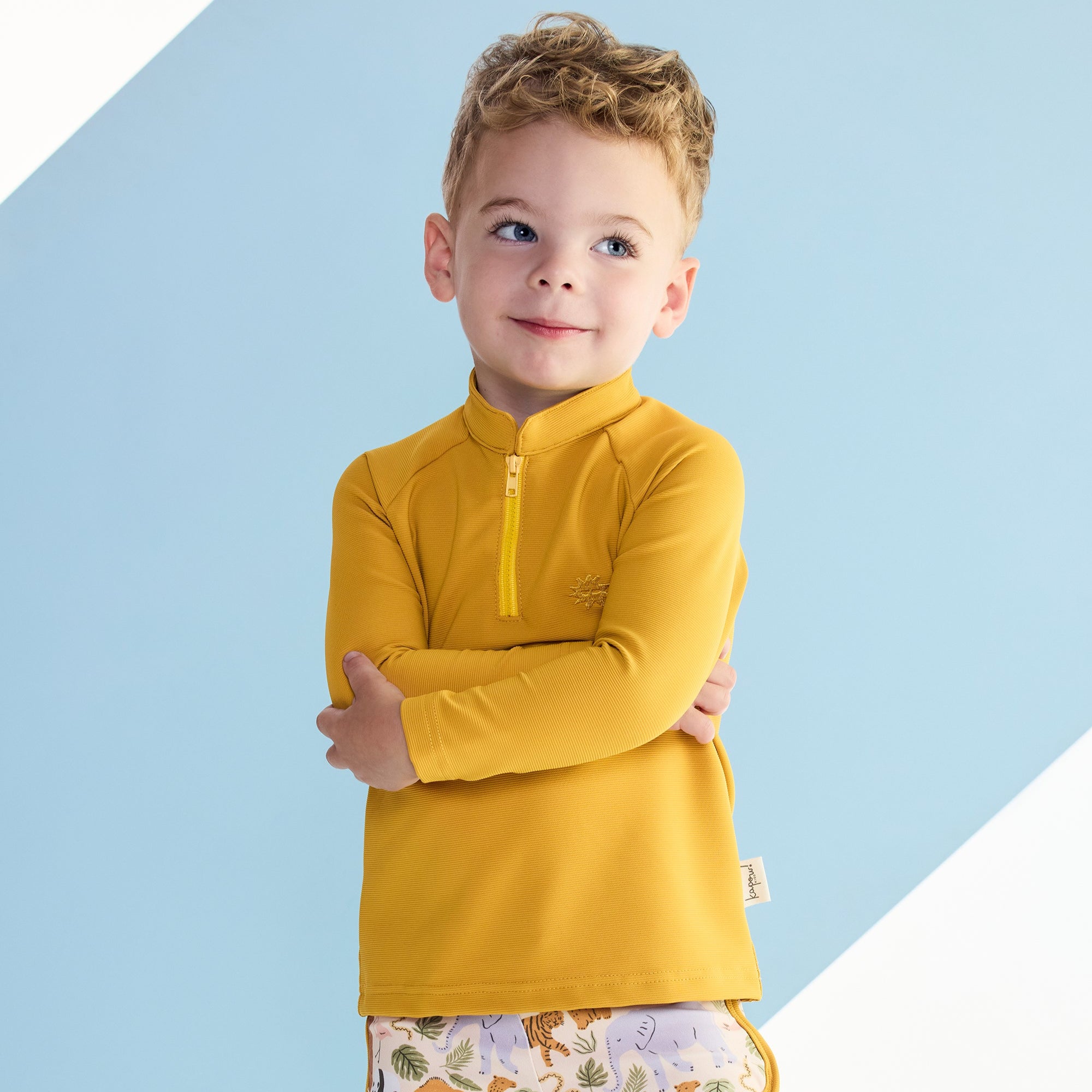 Dive into fun with the Animal Kingdom Rashie made from mustard ribbed fabric and offers UPF50+ protection. This rashie keeps little adventurers safe from the sun while adding a cool, textured look perfect for pool days or beach trips. Stretchy and comfortable, it moves with every splash and play under the sun! Pair with the matching Animal Kingdom Swim Trunks for the complete look.