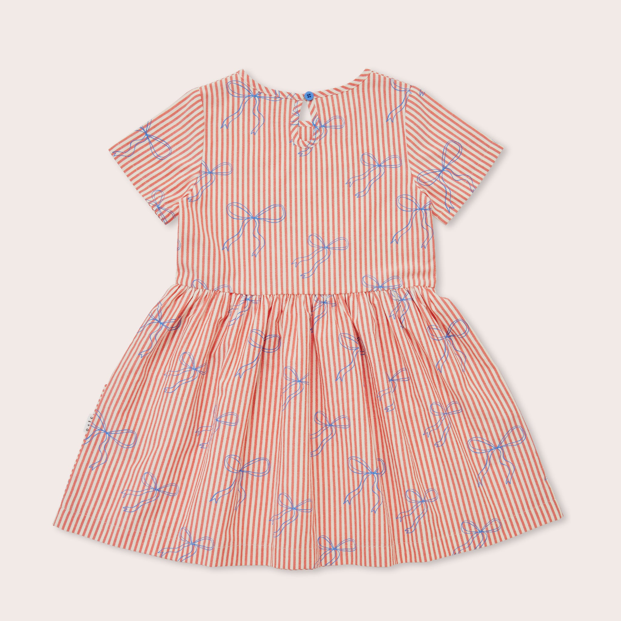 Cream and faded red base fabric with soft blue bows blowing in the breeze printed all over. Button opening on the back for easy dressing, large feature pockets on the front and a blue O+TC logo. Our Ruby Ribbon dress is beautiful no matter the occasion, but would make a beautiful Christmas Day dress!