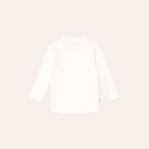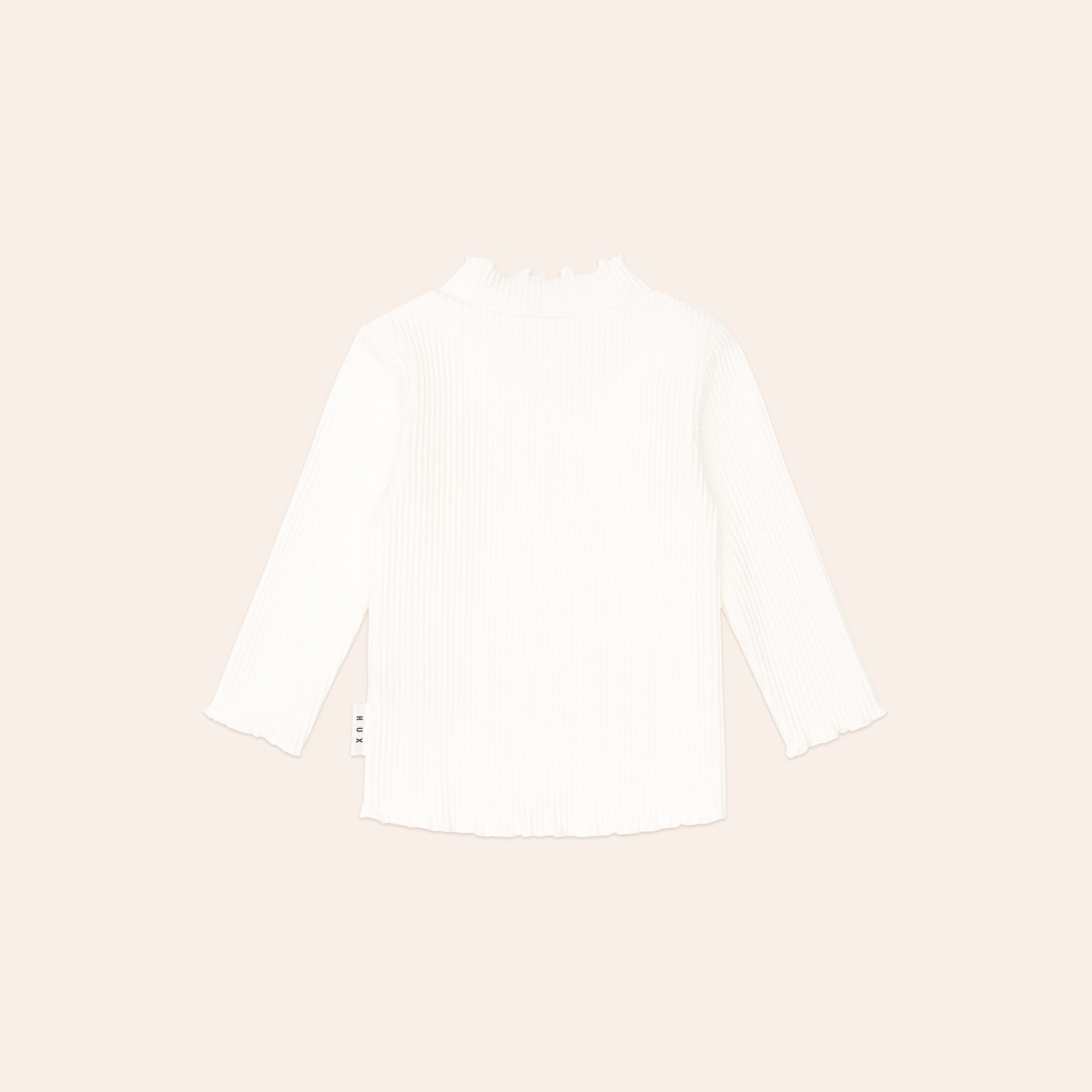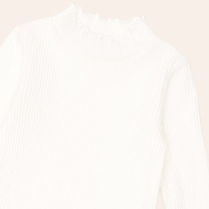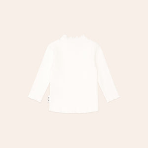 A versatile layering piece in classic almond milk. This long-sleeved top is made from extra thick ribbed cotton to keep little bodies warm and features a sweet lettuce edge detail. A true wardrobe essential.
