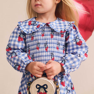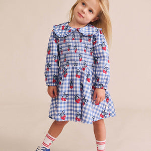 Be best dressed in this pretty long sleeved dress. Made from soft organic cotton in our custom cherry gingham print, it has a stretchy shirred bodice, sweet peter pan collar, and a full skirt made for twirling. Bring on the dancefloor.