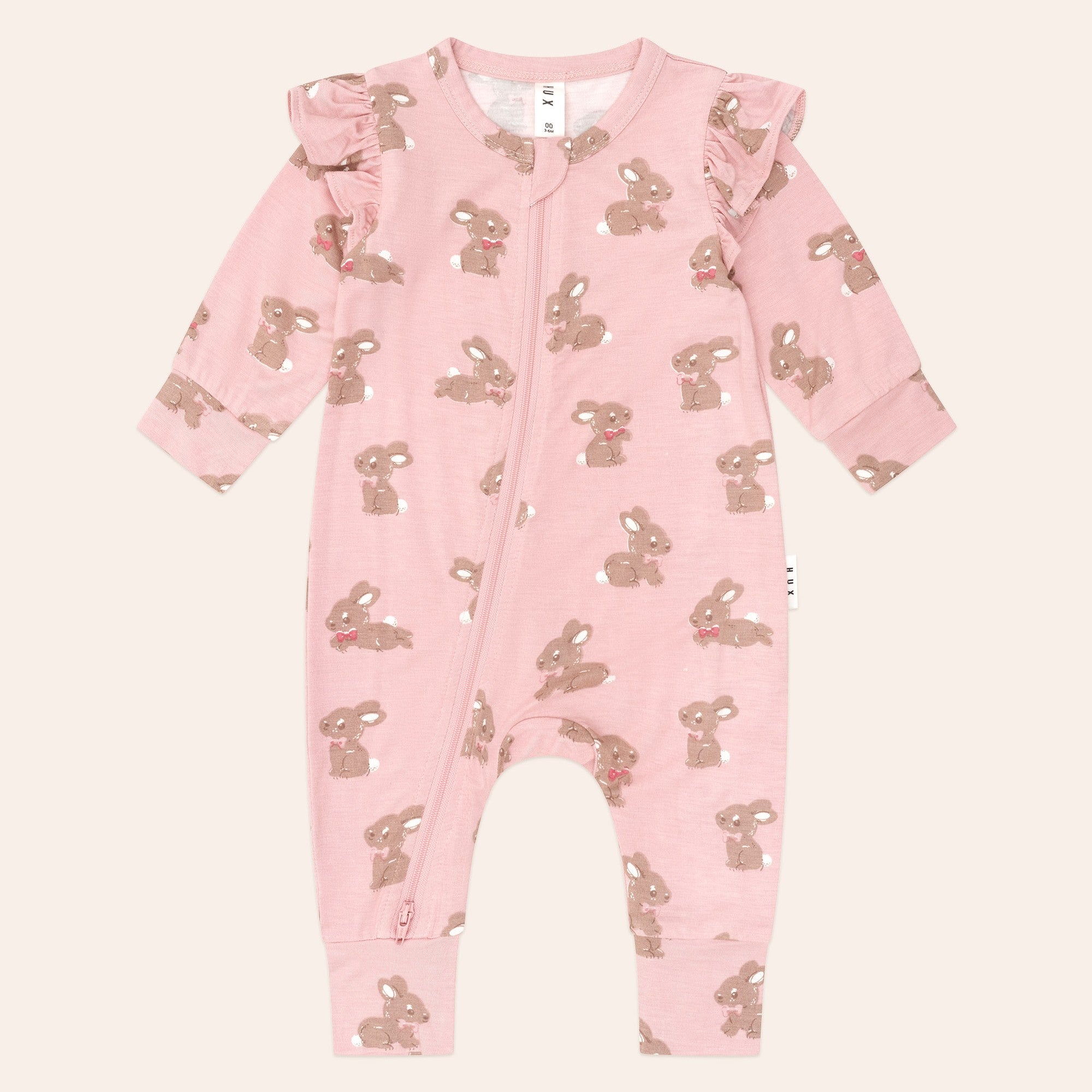 This buttery soft romper is made from the most delicious bamboo blend that baby will love. It has sweet shoulder frills and a cute bunny print. It features a full length, two-way zipper for easy nappy changes and a safety fold zip for peace of mind. Just add squishy legs.