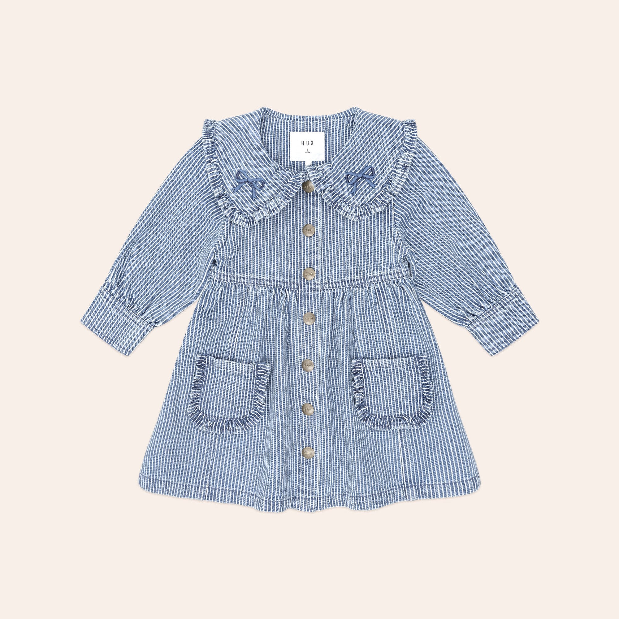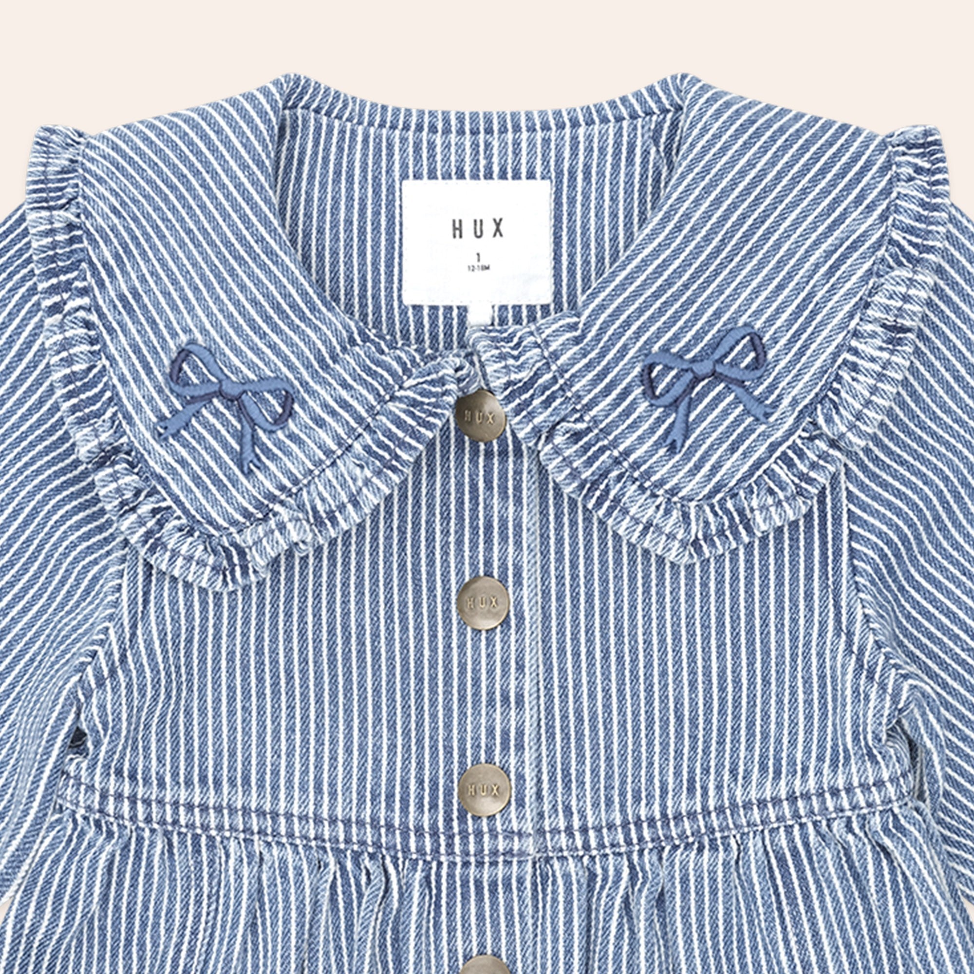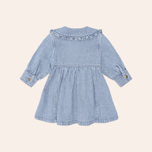 The prettiest denim dress. This vintage style dress is made from soft-as-butter denim. Featuring a frilled peter pan collar with custom embroidered bows, antique brass snap buttons, and a full skirt for twirling, it doesn’t get much cuter than this.