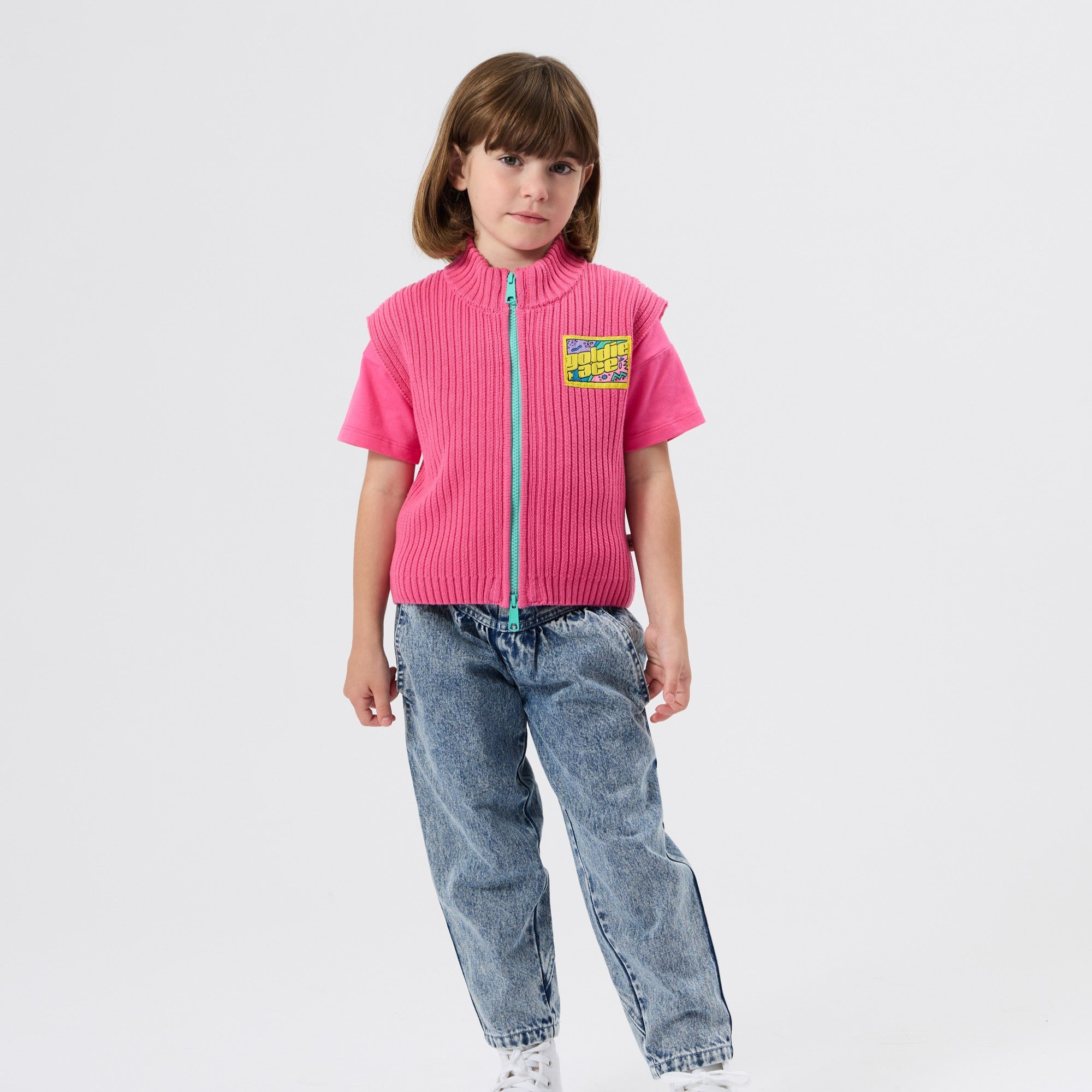 This rib knit vest in pink features a boxy fit and a convenient 2-way zip opening at the front. Crafted by Goldie + Ace, it offers a comfortable rib construction. Made from 100% cotton, exclusive of trims.