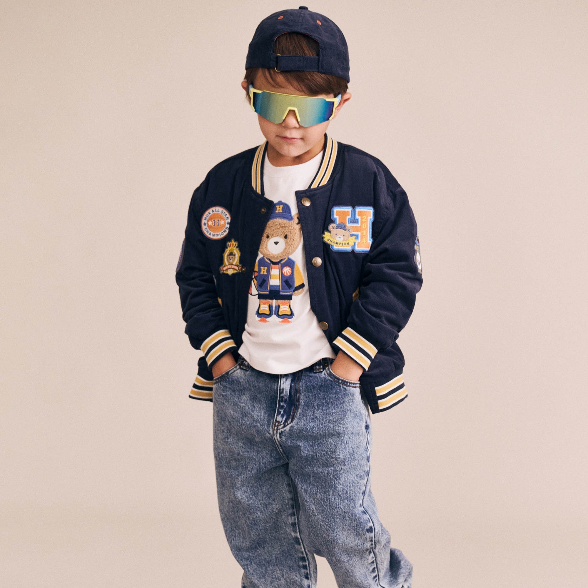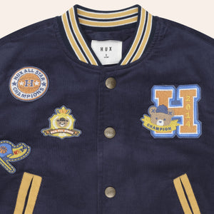 Meet your new favourite layering piece. This college style cord jacket in navy blue features varsity patches on the front, back and sleeves, deep pockets, and antique brace snaps. The perfect in between weather cover up.