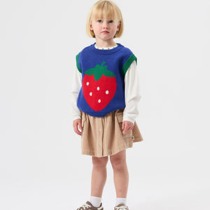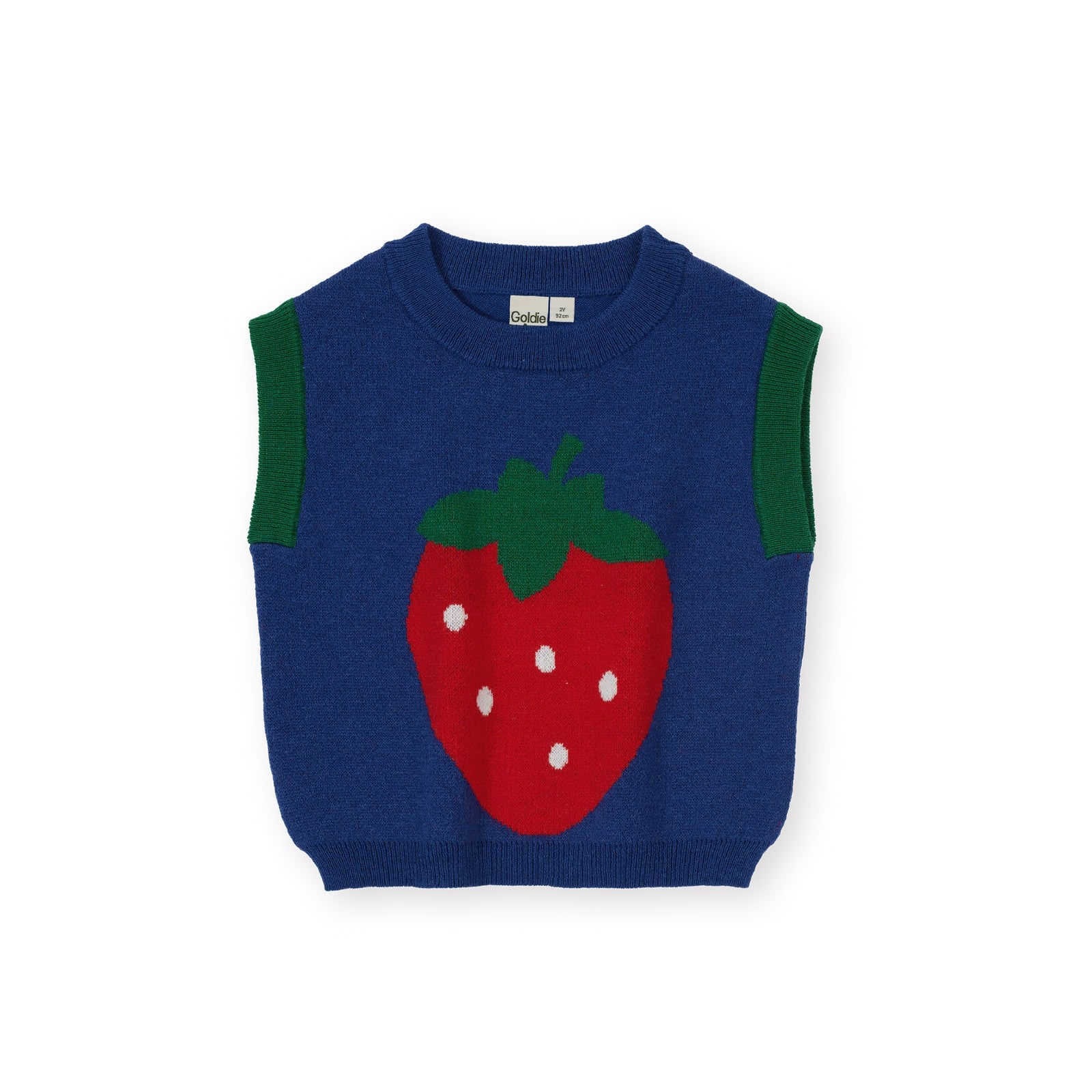 This classic blue vest from Goldie + Ace features a charming jacquard strawberry design. With a soft handfeel and a boxy fit, it's crafted for comfort and style. Fabric composition: 47% acrylic, 43% nylon, 10% wool.