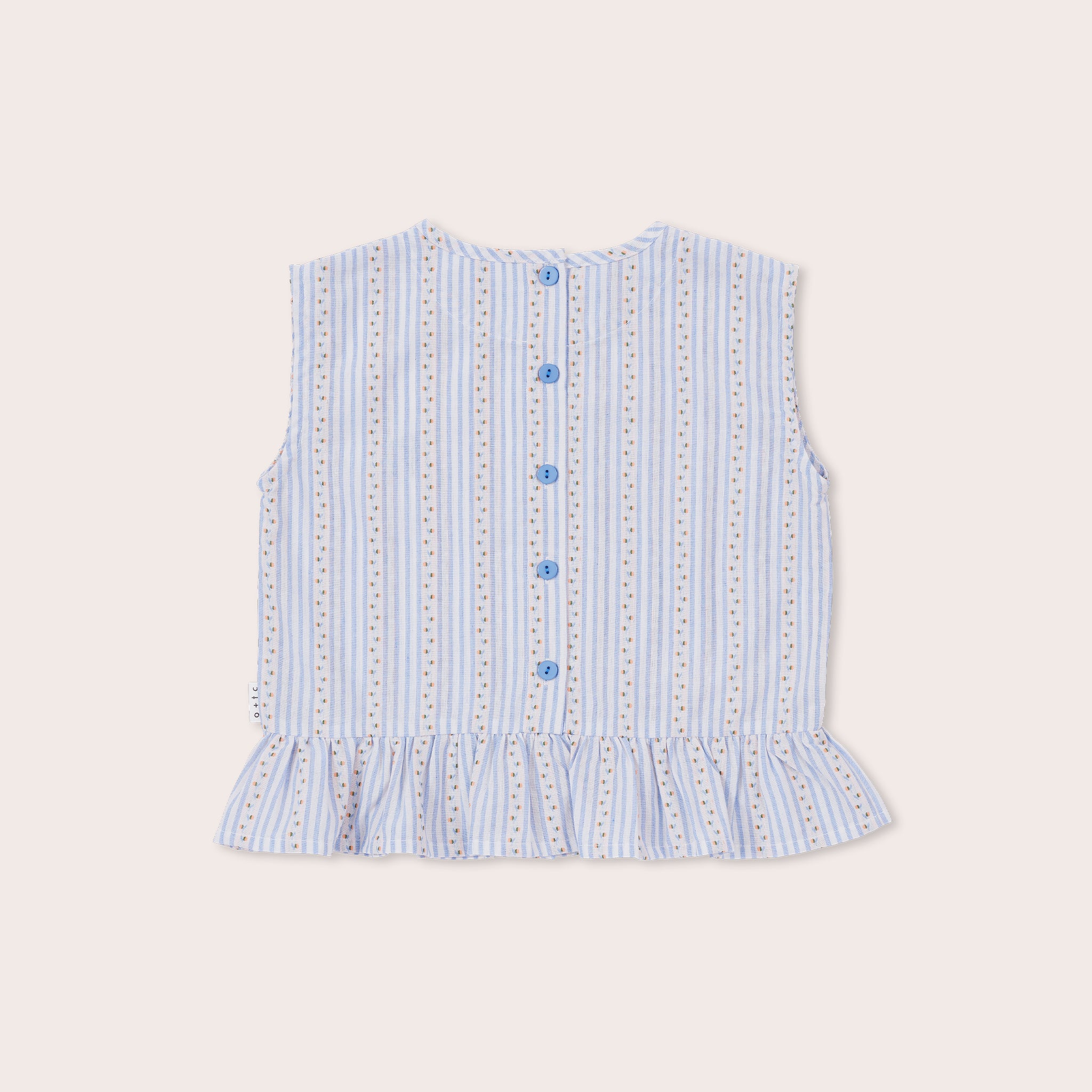 Lightweight blue and white stripe cotton with delicate embroidered peaches. Perfect for summer playdates or casual kids outfits.