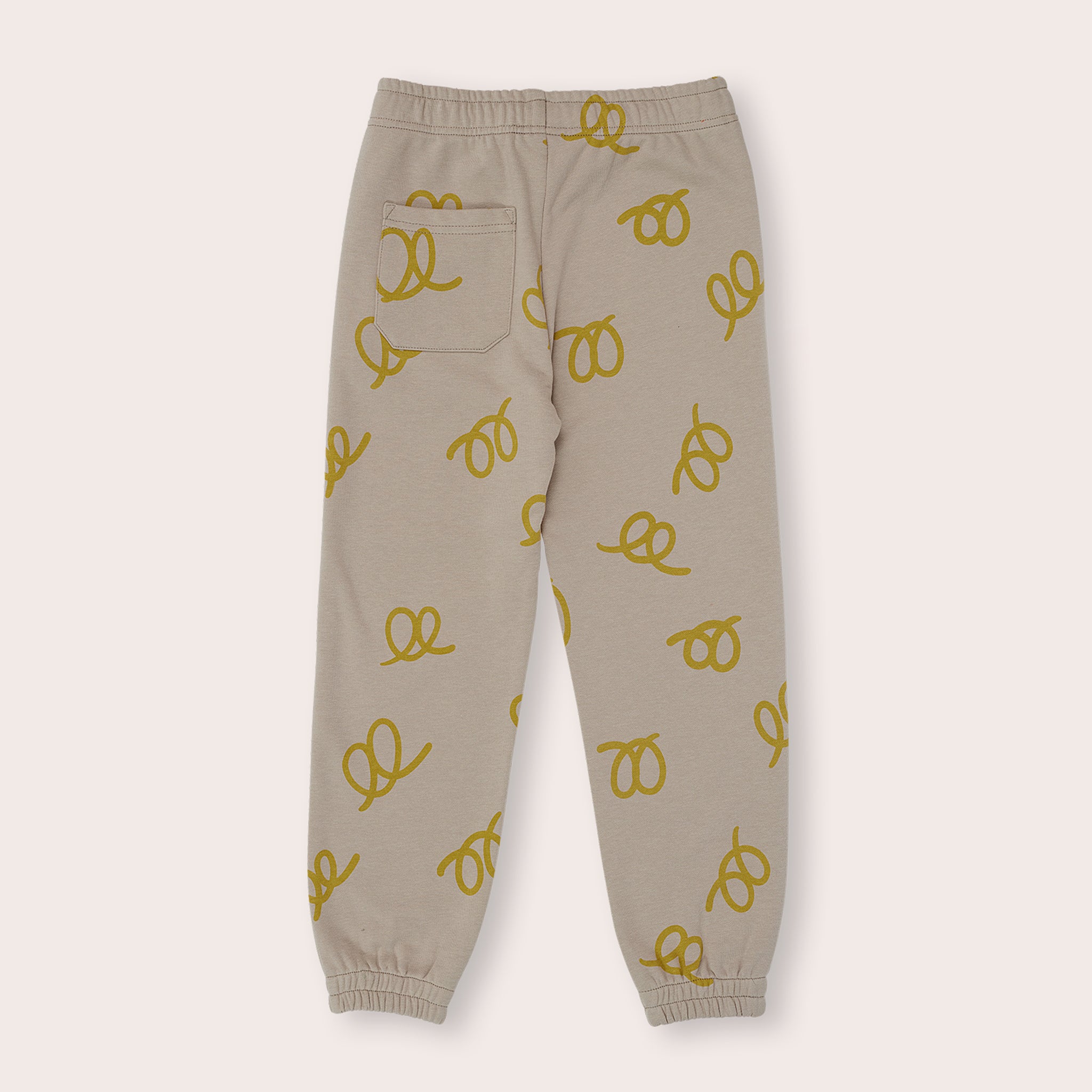 Grey French terry with golden green pretzels printed all over.