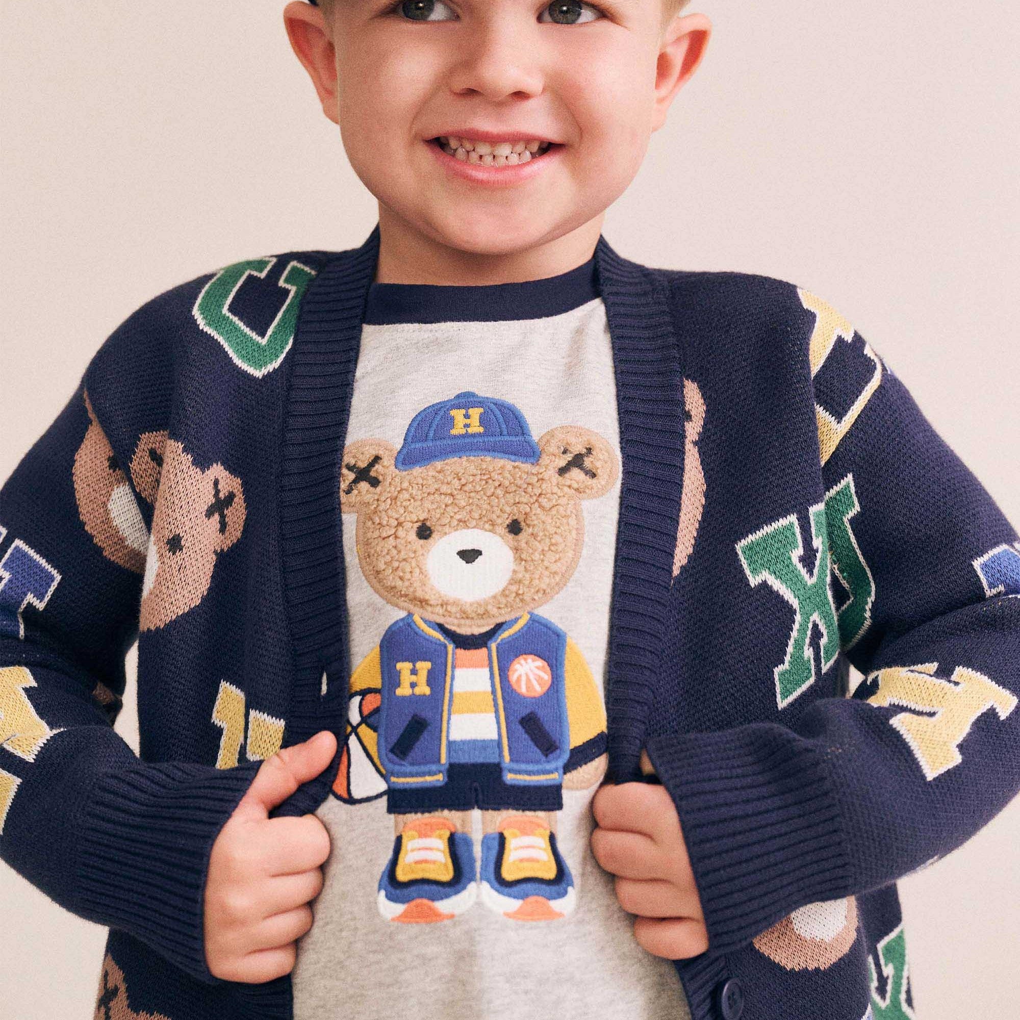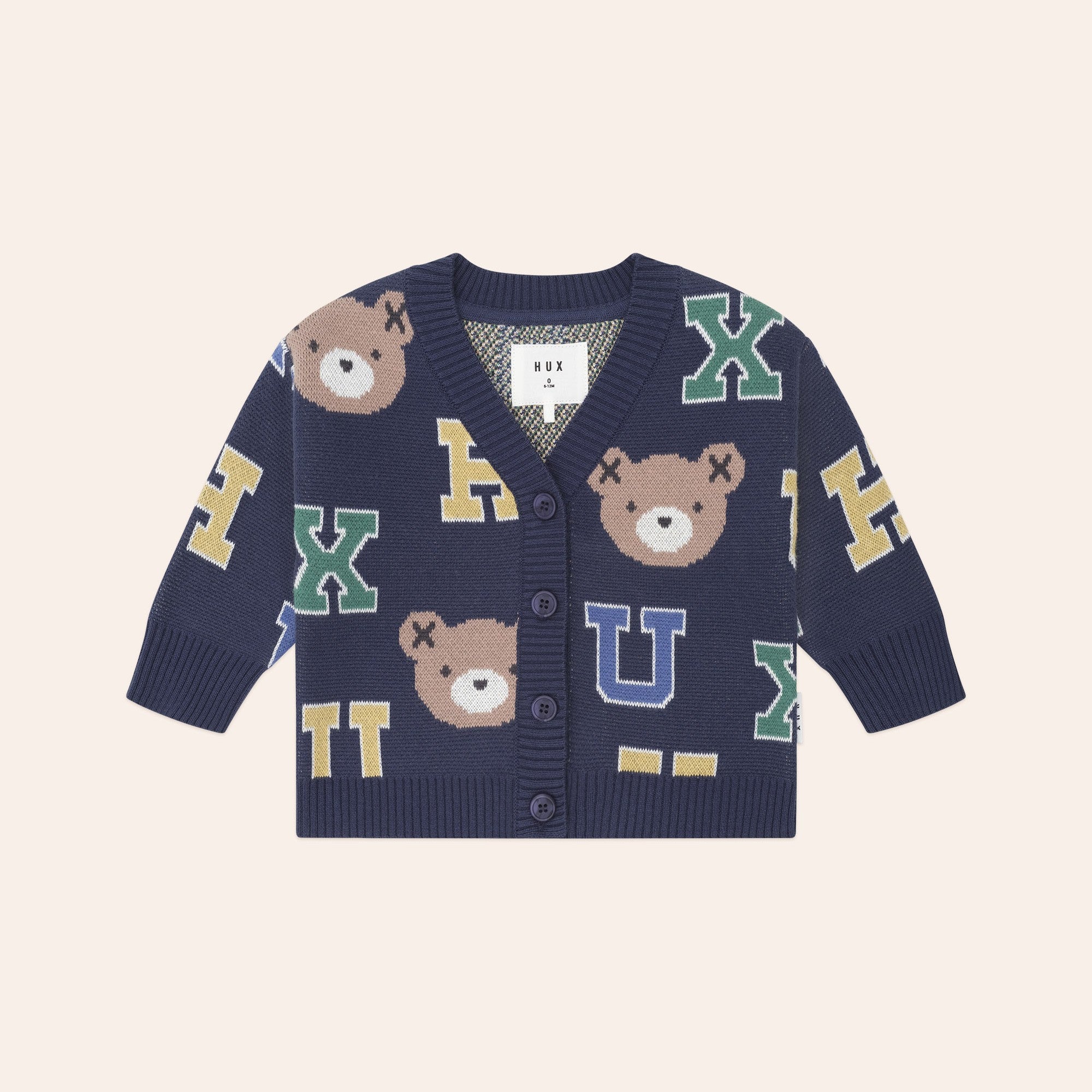 Meet the ‘wear everywhere’ cardi. This lightweight knit cardi is made from premium organic cotton in a deliciously soft jacquard knit. Featuring front pockets and our custom Varsity Hux lettering print, it'll keep them snug as a bug—or a bear.