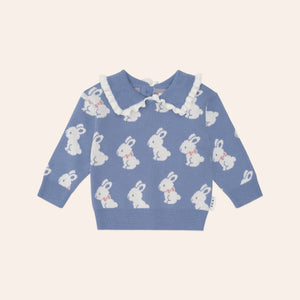 Winter warmer, but make it fancy. This knit jumper is made from premium organic cotton in a deliciously soft jacquard knit. Light enough to layer and cosy enough to wear on its own, it features a frill collar and elasticised hems for easy wear. Featuring shoulder buttons in baby sizes for easy dressing.