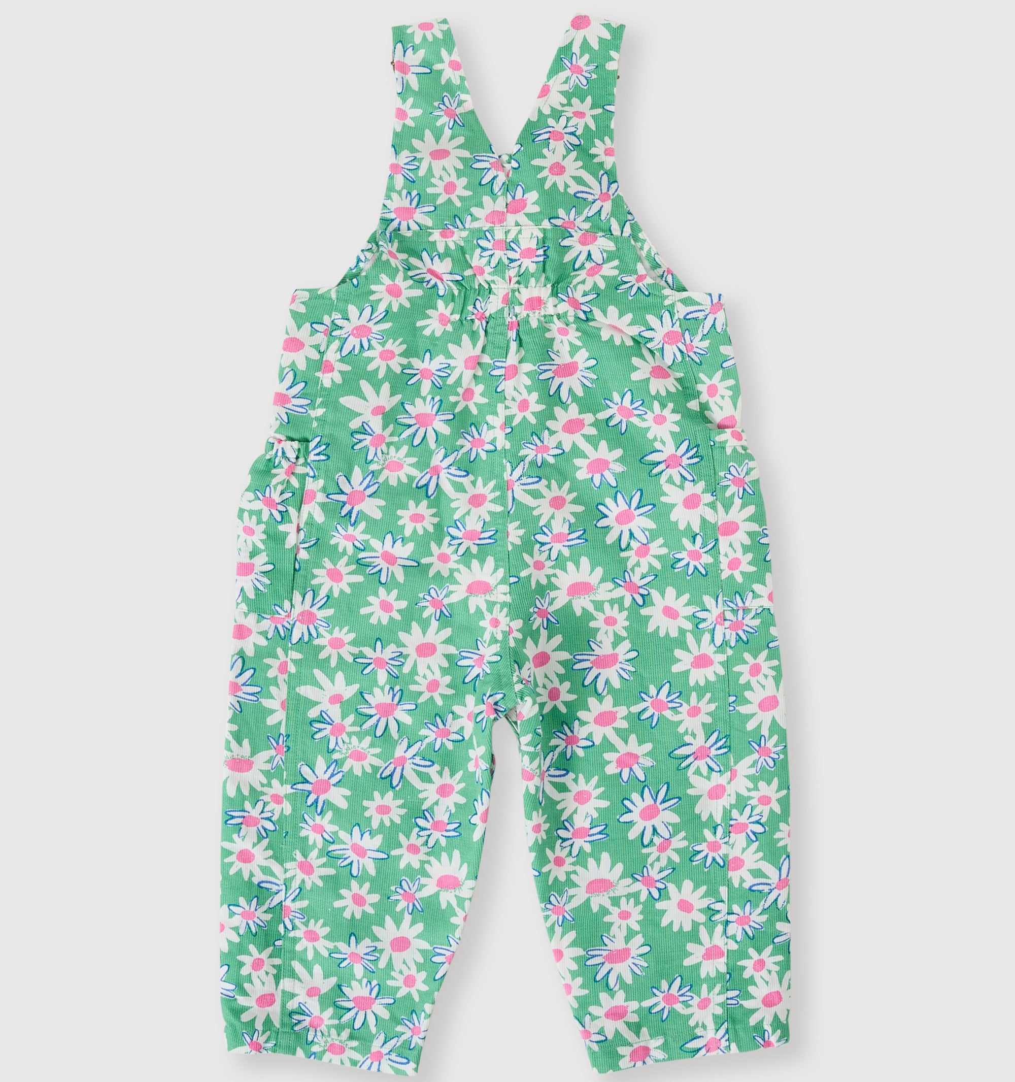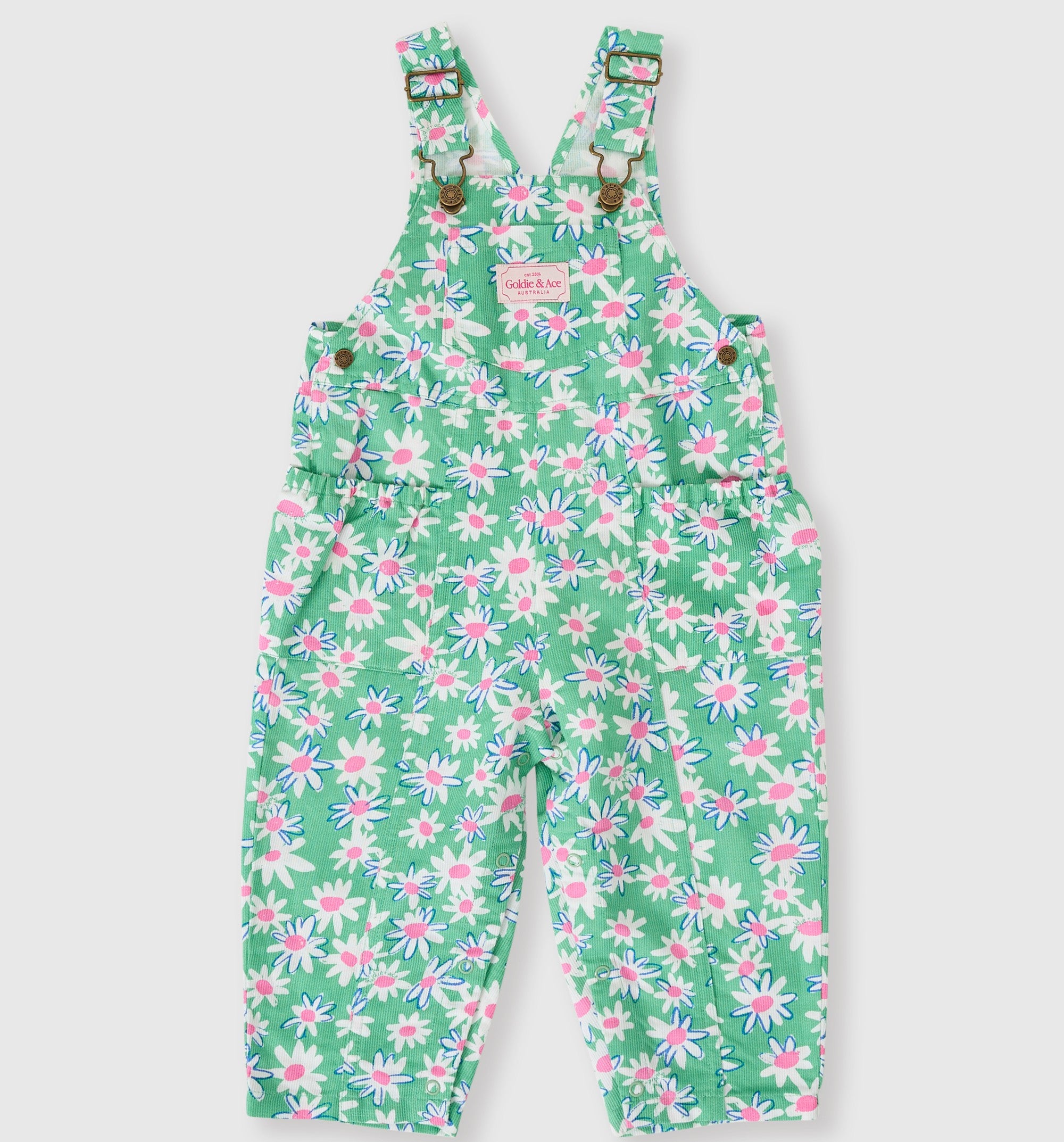 True to size. Relaxed fit. A fun twist on the classic Austin overalls with the addition of functional wrap around pockets. Adjustable straps with brass clasps for room to grow and leg snaps up to a size 2 for easy dressing. Hand drawn daisy print.