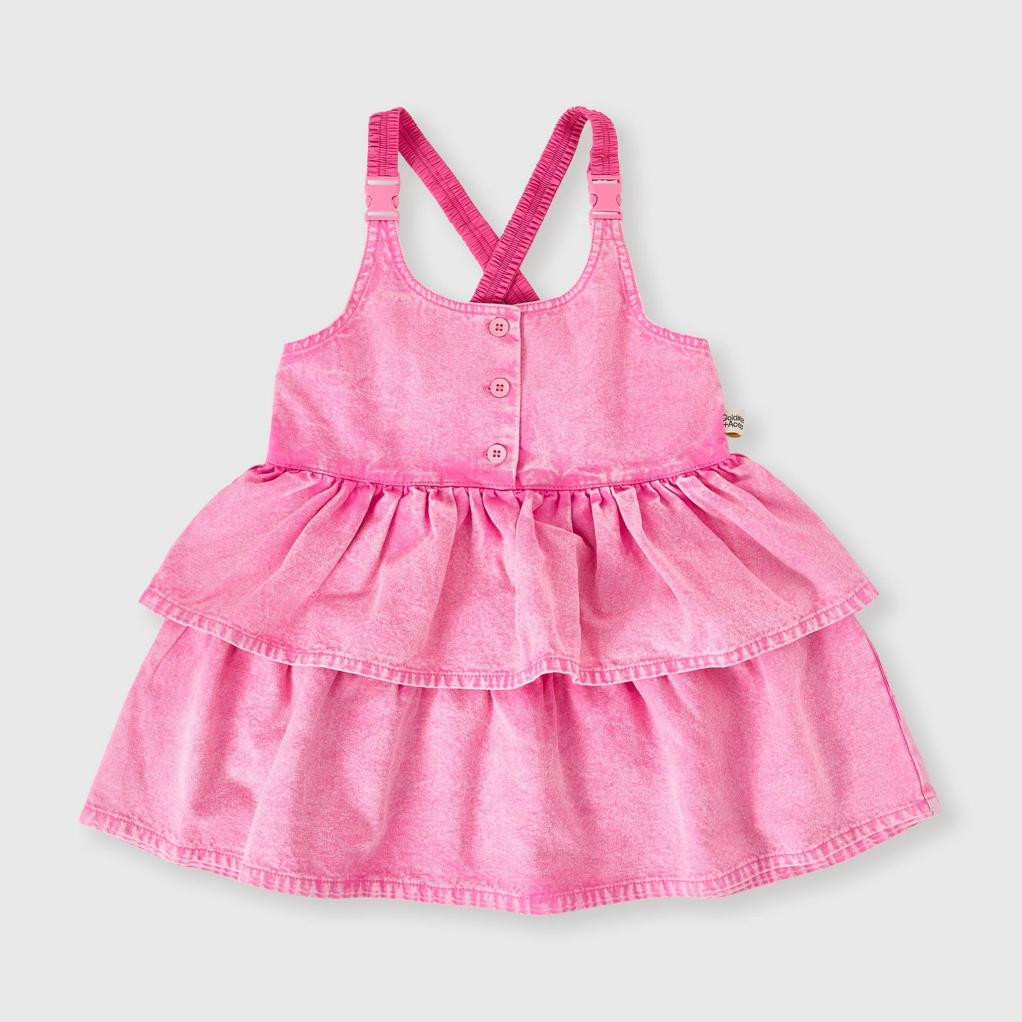 True to size. Relaxed fit. Tiered pinafore style dress with retro elasticated straps and buckle fasteners. Adjustable straps at back for room to grow.
