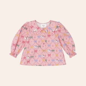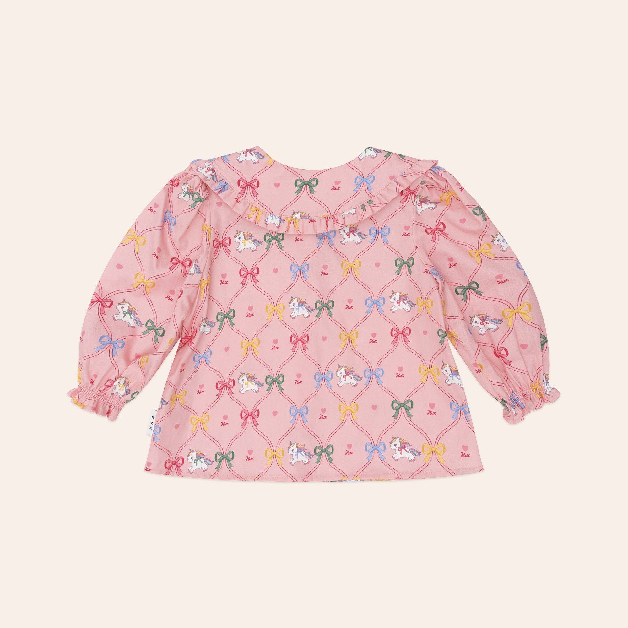 The perfect blouse. Made from super soft, lightweight organic cotton, it features puff sleeves, buttoned front, frilly collar, and magical unicorn print. Wear it alone or layer it with a pinafore.