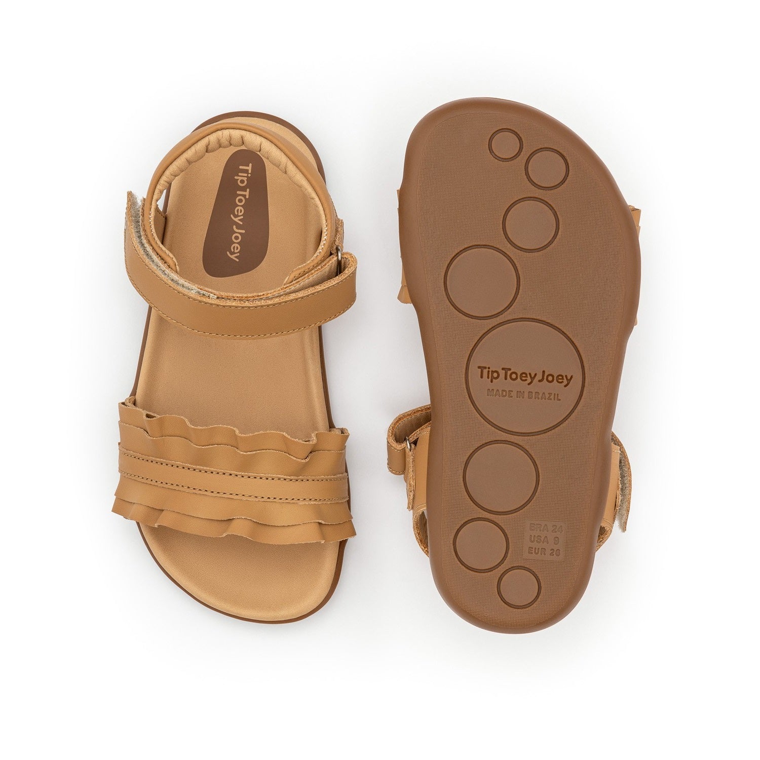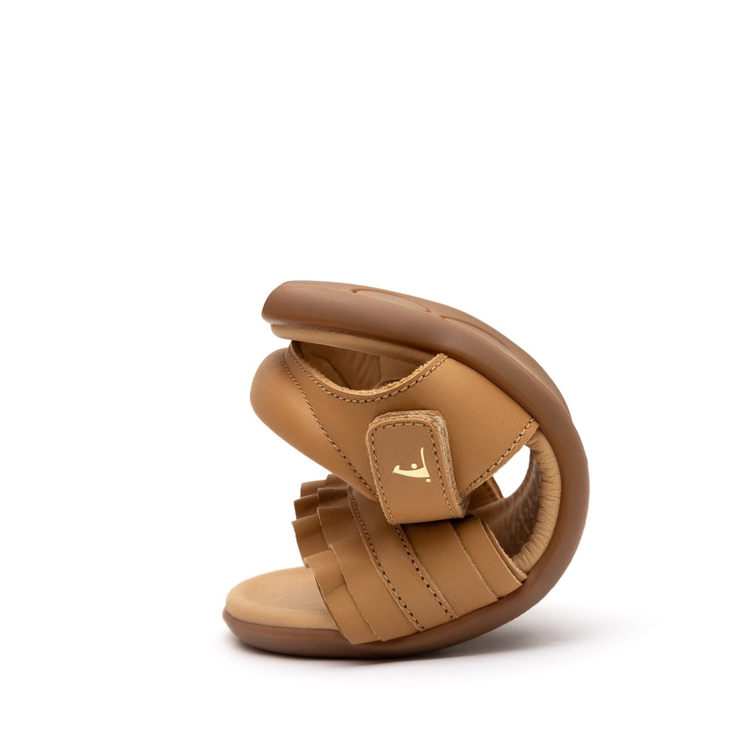 With a flat sole, and no heels or elevations, the Ruffle sandal is zero drop and promotes the natural development of the growing foot. The frill strap on the upper is closed, but the velcro fastener is on top.