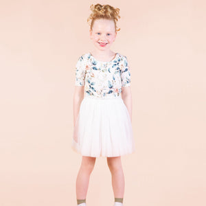 Introducing our Adeline Circus Dress! Made from 95% cotton and 5% elastane jersey, the bodice features short sleeves, a leotard scoop neck and a cream base with a floral pattern. The skirting eatures layers of cream tulle made from 100% polyester tulle.