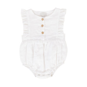 Ruffle romper with frill sleeves and contrast wooden buttons.