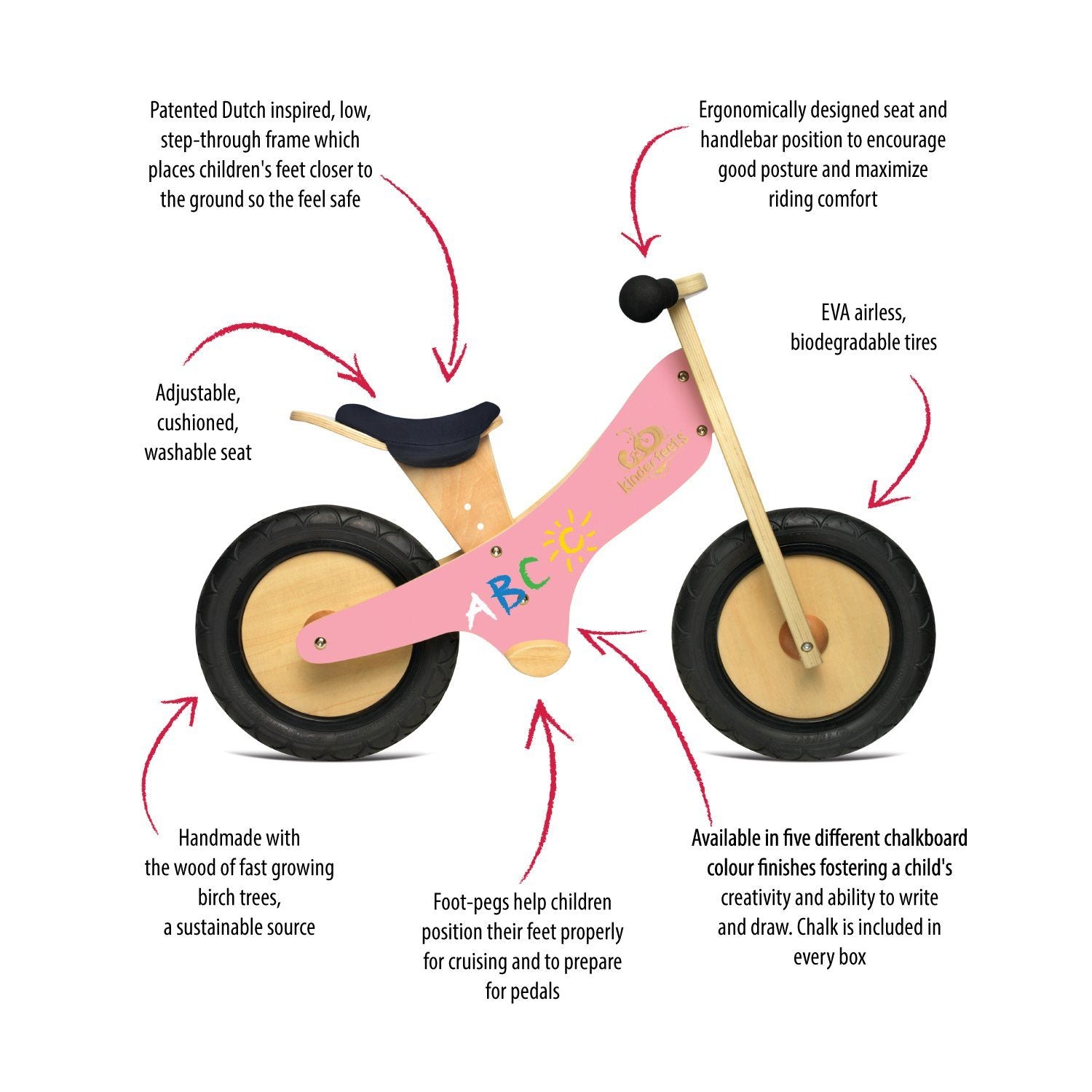 Patented, award winning balance bike with chalkboard finish allowing kids to decorate the bike in their own unique style. Ergonomically designed seat and handlebar position to encourage good posture and maximise comfort. Washable cushion seat. Adjustable seat height: 30.5 to 38 cms. EVA airless biodegradable tires. Foot pegs to help children position their feet properly for cruising and to prepare for pedals.