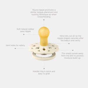 BIBS Colour pacifier is the original BIBS pacifier and has been on the market for over 40 years. It has the signature round BIBS shield with three vent holes and round BIBS engraved handle ring.