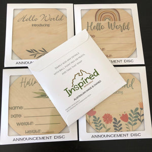 This 14cm round printed wood disc is a beautiful birth announcement photo prop. Simply write your baby's birth details in ball point pen or pencil and capture that special first photo.