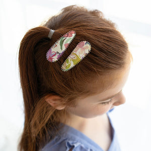 A quality set of fabric covered snap clipsSold in sets of two these timeless hair clips are finished using a range of Liberty London prints along with a selection of fabrics designed by The Rifle Paper Co.Featuring a unique scalloped edge detail which creates a fun touch of unique feminine detail.Our Josie Joan’s hair clips are super soft, comfortable and easy to wear. Designed to help what can be a difficult task seem simple.