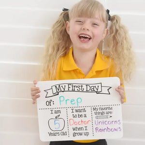 This reusable photo plaque features the wording "My first day of" and prompts to record the special details of this day. Printed with high quality UV inks onto 3mm white Acrylic, the reusable plaque measures 30cm x 21cm and by using white board markers or chalk pens you can add the details, making this a lasting milestone photo prop. Can be easily cleaned with a tissue or soft damp cloth.