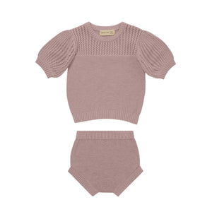 This sweet sweater set features a pointelle knit pattern with puff sleeves and includes bloomers to complete the outfit.