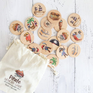 This pirate theme memory match game is incredibly versatile, perfect as a memory game, for open ended play or as an educational resource. Designed and made in Australia this 28 piece set has 14 different pirate themed prints and comes in a printed calico bag for storage. The perfect little travel game for a picnic, visit to grandmas or holiday, each disc is 3mm thick and 50mm in diameter.