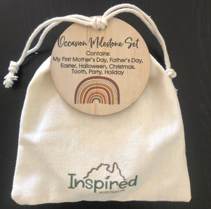 Printed with high quality UV inks onto 3mm plywood, each disc measures 10cm in diameter. This on trend gender neutral rainbow design set contains the following 8 "My First" discs; Mother's Day, Father's Day, Easter, Christmas, Halloween, Tooth, Party & Holiday. These come packaged in a natural cotton draw string bag with printed wooden tag.