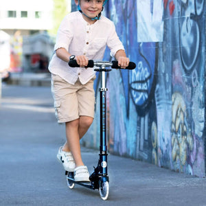The sturdy yet lightweight aluminum frame extends up to 152cm in height. The grippy footplate provides comfort and stability, while the one-click fold and convenient kickstand make it easy to carry and store.