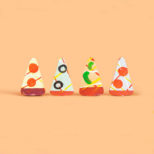 • 4 Pizza slices (1 yellow,  1 orange, 1 green, 1 blue, all decorated with toppings and red metallic crust)
