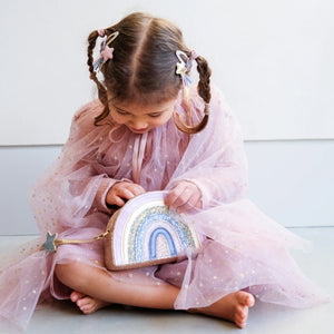 Add some serious sparkle to their outfit with our brand new Space unicorn rainbow bag! Crafted from the prettiest mix of glitter and matt metallic fabrics, this super fun bag is sure to brighten up any dull day!
